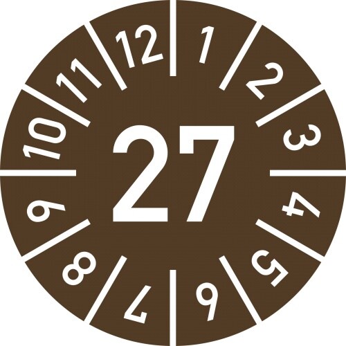 Dreifke® Prüfplakette Jahr 27 mit Monaten, braun, Folie-Spezialkl., Ø 20 mm, 10 St./Bo.
