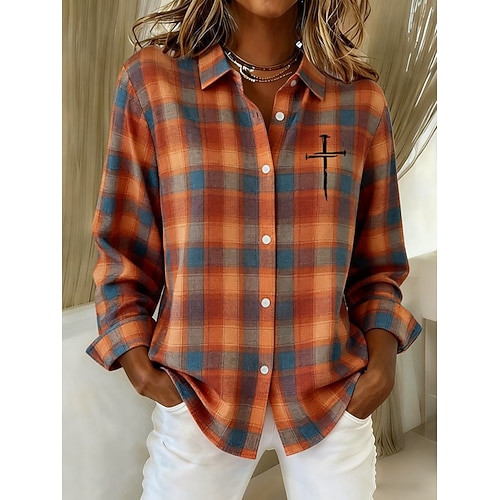 Per donna Camicia Camicia button-down Camicia casual Blusa Bottoni Plaid Vintage Elegante Classico Manica Lunga Colletto a Camicia Top Regolari Quotidiano Ferie Uscire Arancione Estate Primavera