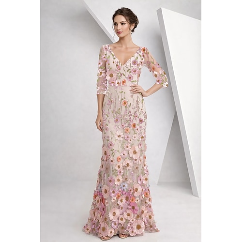 Linea ad A Lunghezza al pavimento Abito da cerimonia per signora Mezza Manica Scollo a V Elegante Vintage Formale Pizzo Tulle con Fiori 3D Ricamo Fiore