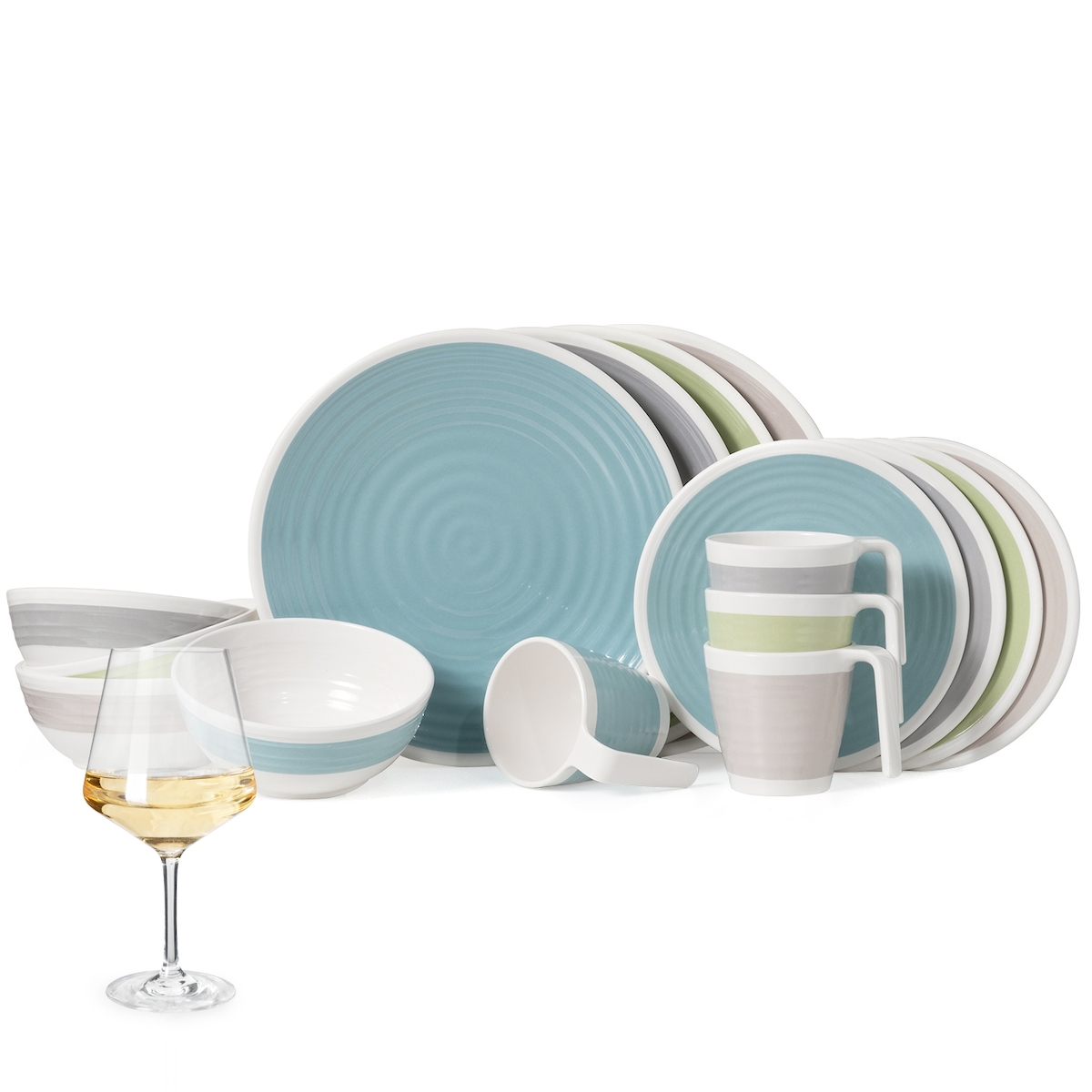 Moritz Melamin Geschirr-Set 4 Personen Harmonie 16 Teilig + 4 Milano Weiß Weingläser Tafelgeschirr Picknick BBQ Kochgeschirr