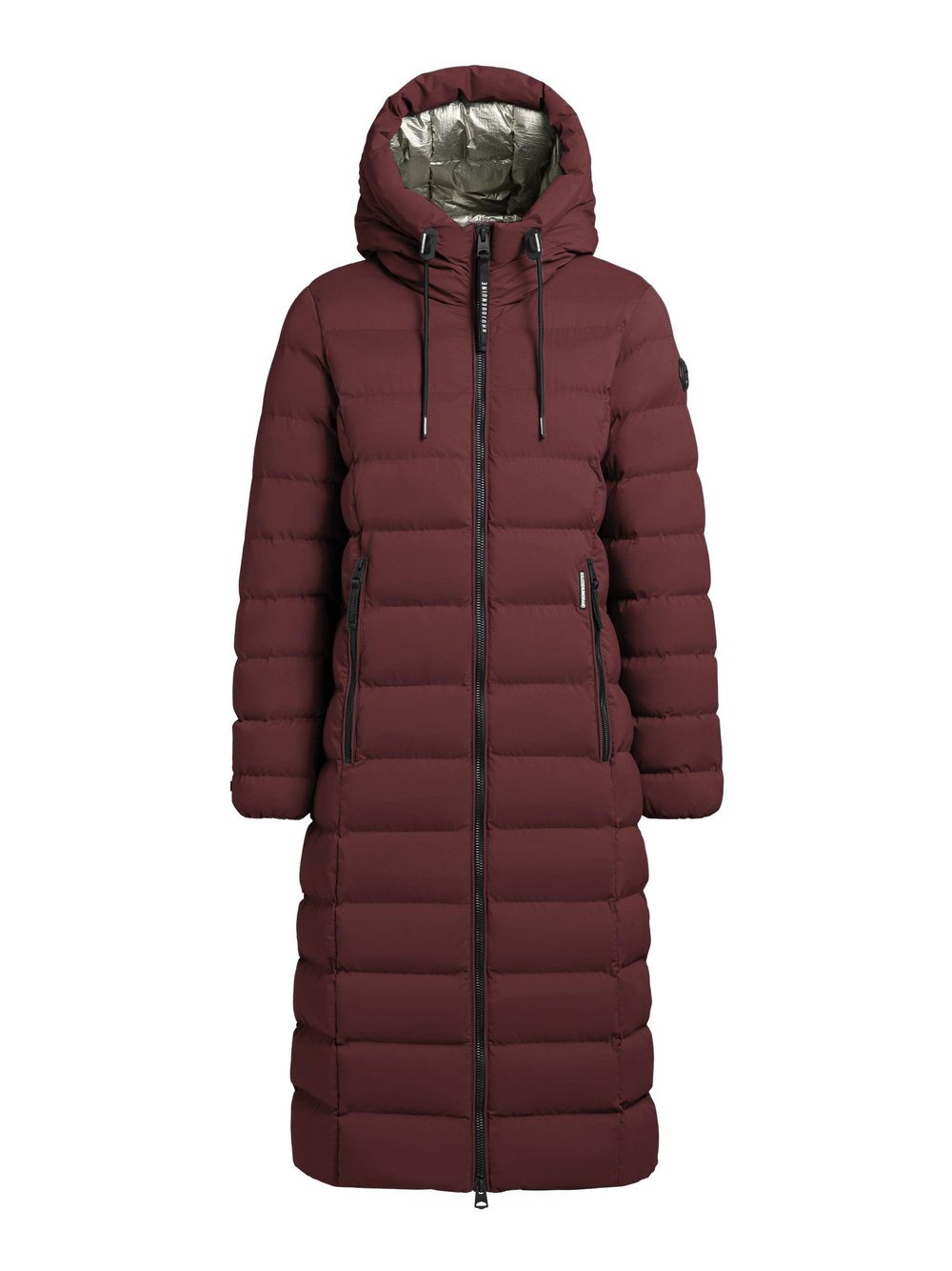 Wintermantel KHUJO "Simmie-YM", Damen, Gr. XS (34), rot (dunkelrot), Obermaterial: 100% Polyester; Innenfutter: 100% Nylon; Wattierung: 100% Polyester, tailliert kniebedeckend, hoch geschlossener Ausschnitt, Ärmel ohne Ärmelschlitz elastischer Bund mit Gu