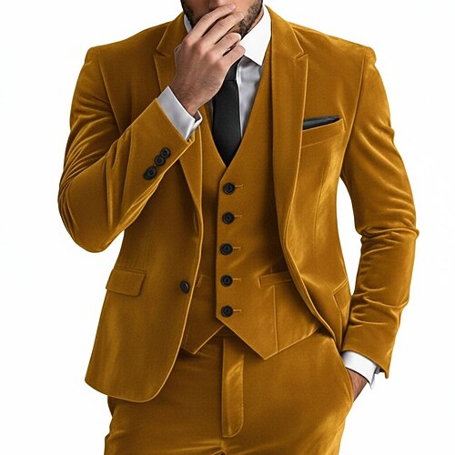 Abiti casual da uomo in velluto da festa, con revers a lancia, giallo rosso, alla moda, tinta unita, vestibilità su misura, 2 pezzi, monopetto, due bottoni