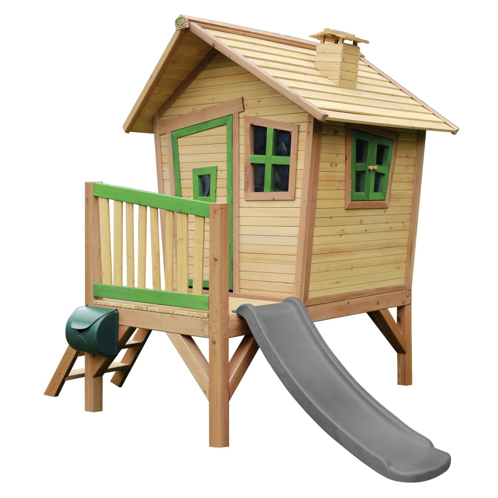 Casetta per bambini con scivolo grigio, legno FSC, marrone/verde