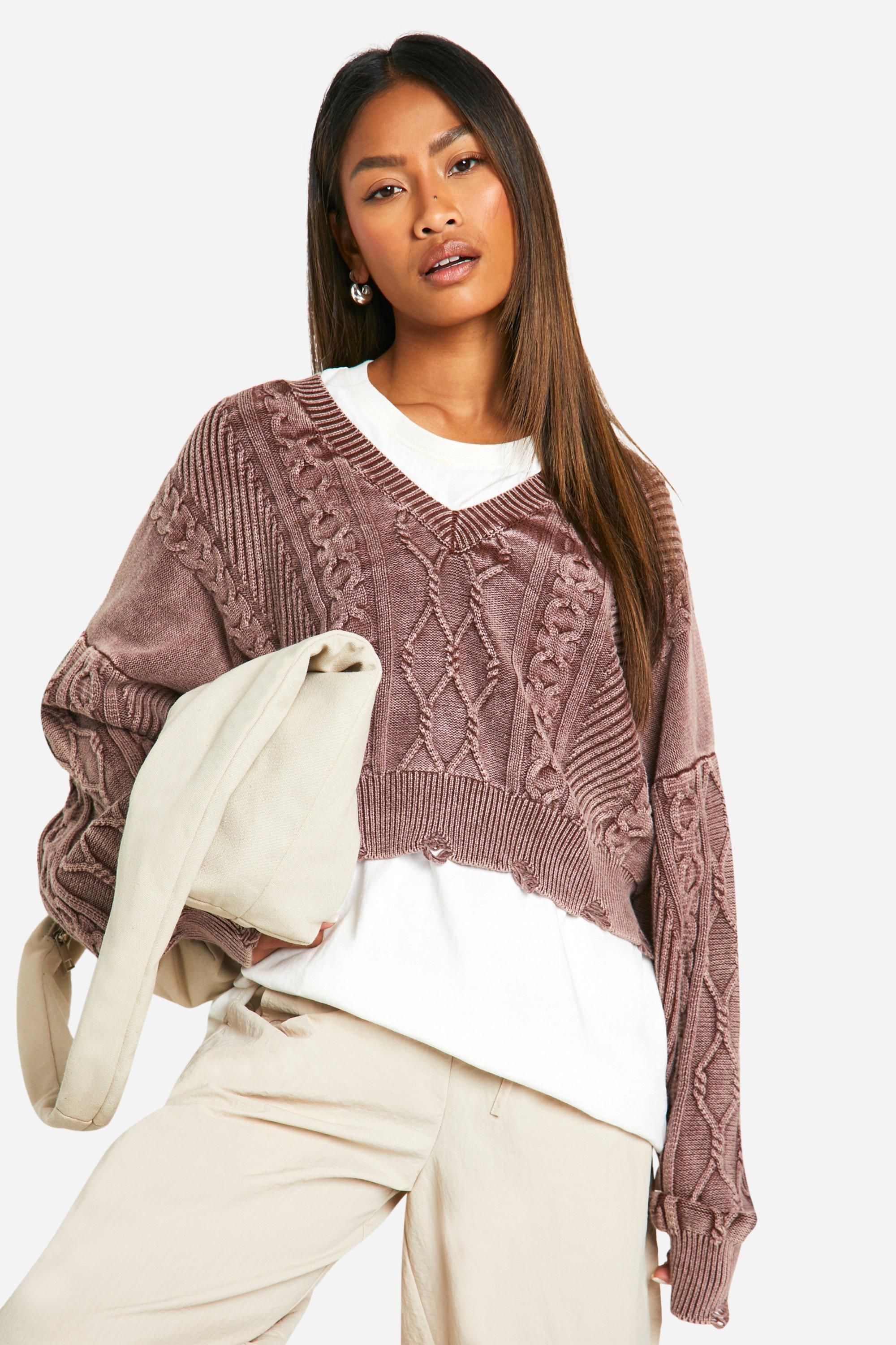 Boohoo Womens Acid Wash Distressed Hem Slouchy Cable Jumper - Purple Cotton - Size Small | Boohoo Sale | Discount Designer Brands