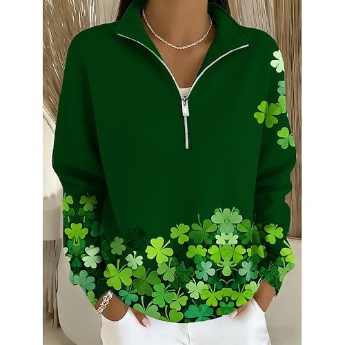 felpe con zip e pullover da donna per San Patrizio, stile trifoglio, moda casual, manica lunga, mezza cerniera, top normali, casual, abbigliamento quotidiano, coulisse, stampa verde, primavera autunno