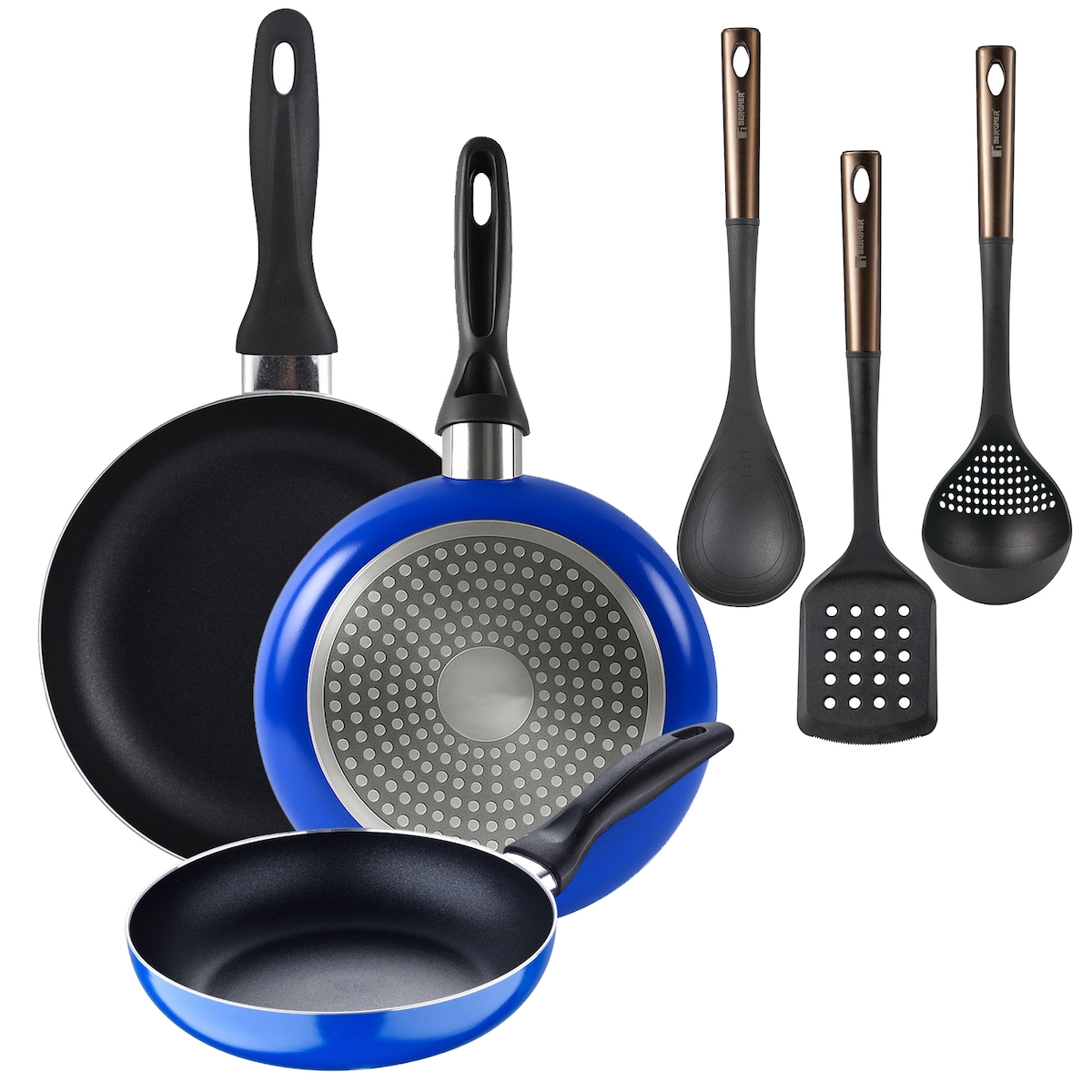 Bergner - Set aus 3 Pfannen Ø16/20/24cm aus gepresstem Aluminium für Induktion Blue Navy mit 3 Küchenutensilien aus schwarzem PBT und Kupfer