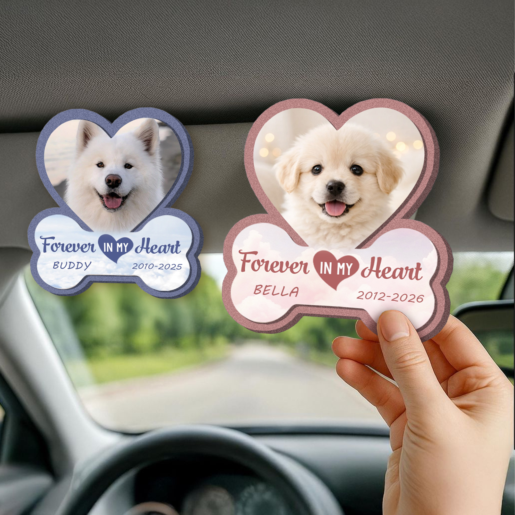 Personalisierte Herz Hundeknochen hölzerne Foto Auto Visier Clip mit Name und Datum Autozubehör Haustier Verlust Gedenkgeschenk für Tierbesitzer Liebhaber