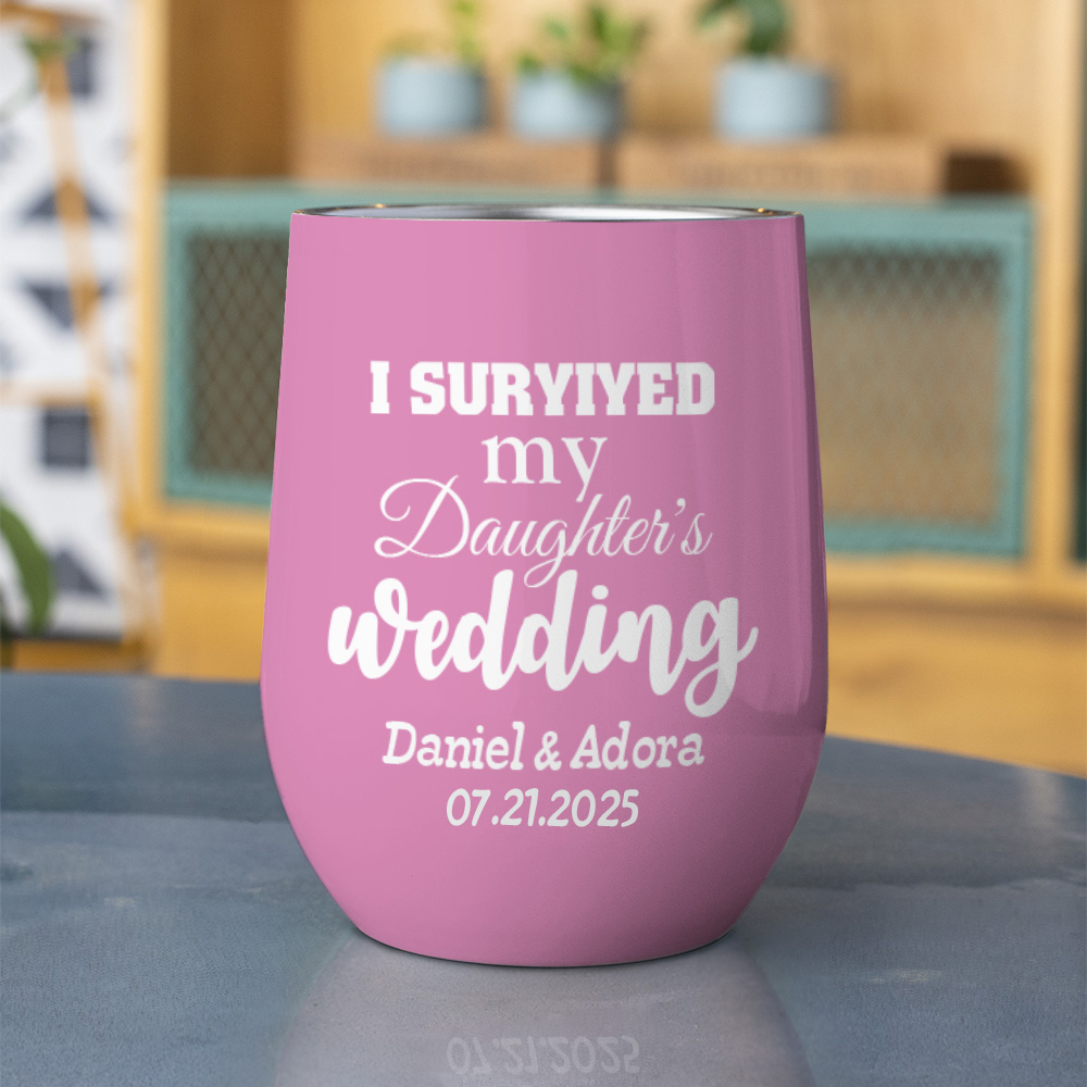 Vaso de Vino Personalizado I Survived My Daughter's Wedding Multicolor 12oz Name Date con Tapa Antiderrame Regalo de Boda para los Padres de la Novia