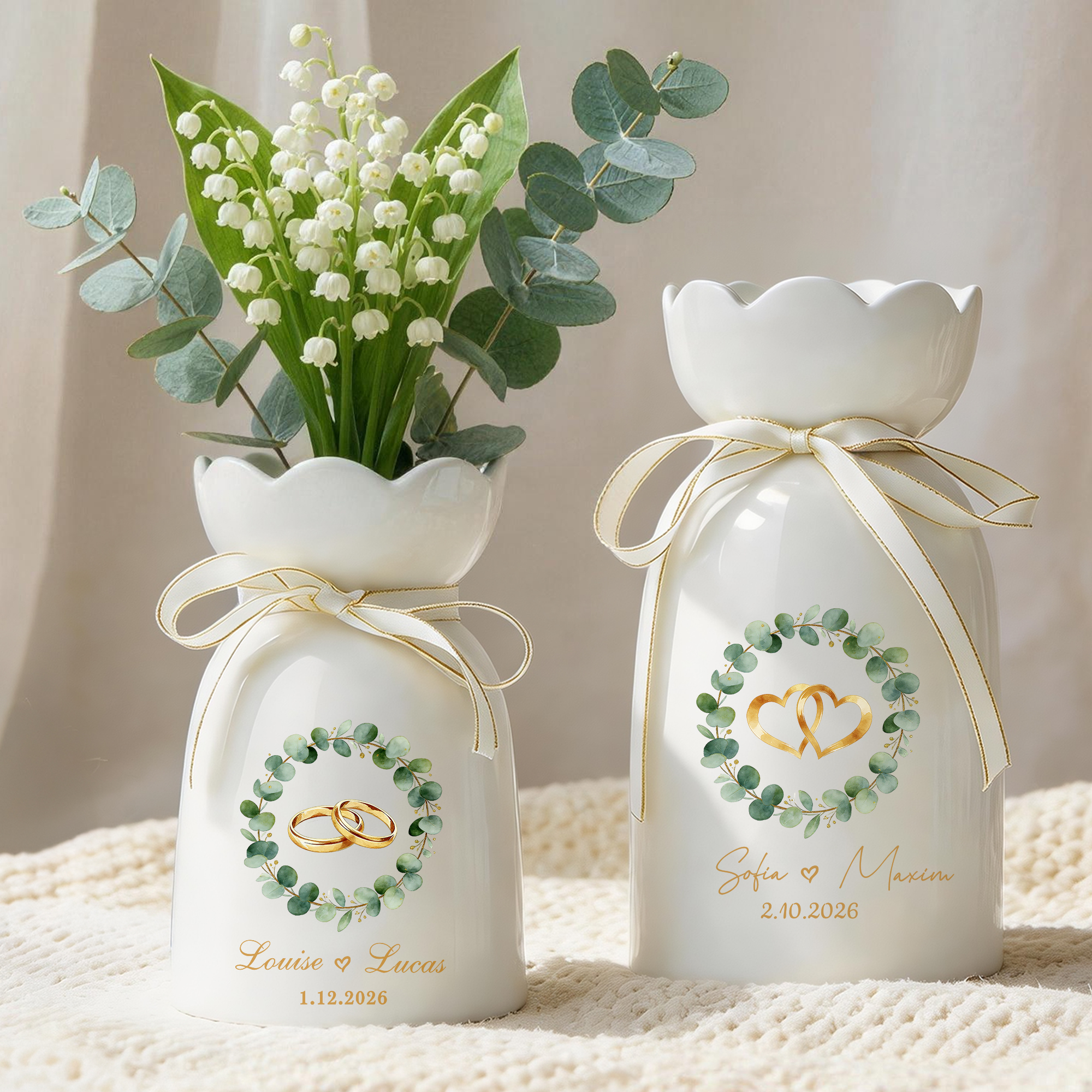 Vase en céramique personnalisé avec nom, texte, date, anniversaire, cadeau de mariage pour un couple de jeunes mariés.
