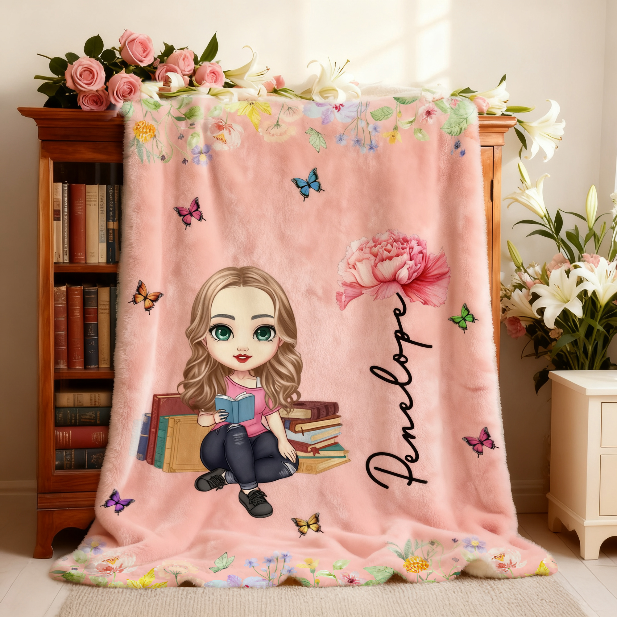 Personalizada Lectura Personaje de dibujos animados Nacimiento Flor Suave manta con nombre Decoración del hogar Cumpleaños Regalo de Navidad para el ratón de biblioteca amante de los libros