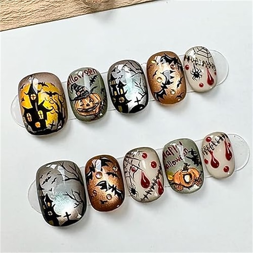 30 pezzi di unghie da gatto, unghie finte corte, unghie finte di Halloween con disegni di ragnatele di zucca e pipistrello gotico, unghie finte color argento e arancione, unghie artificiali a