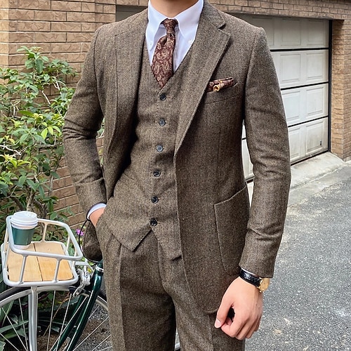 Uomo Matrimonio Feste Completi in Tweed Bavero a lancia Nero Caffè Quotidiano Casual Tinta unita Vestibilità su misura 3 pezzi Monopetto Due Bottoni