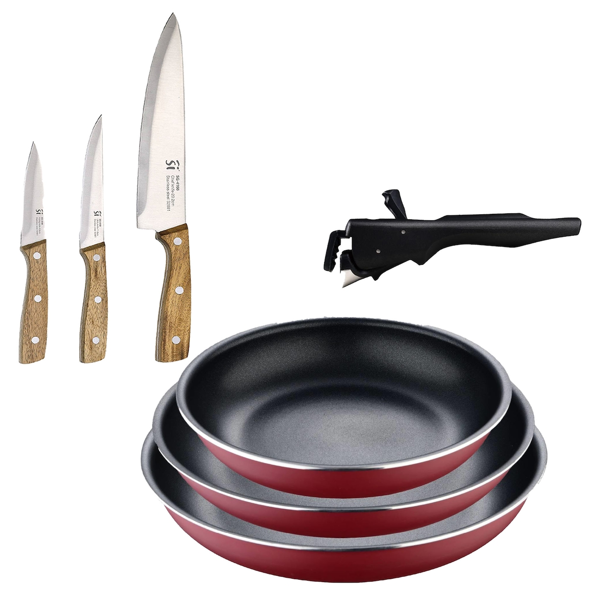 BERGNER - Set aus 3 Pfannen Ø16/20/24cm aus gepresstem Aluminium in metallic-blau mit 3-teiliges Edelstahlmesser-Set mit magnetischer Wandhalterung