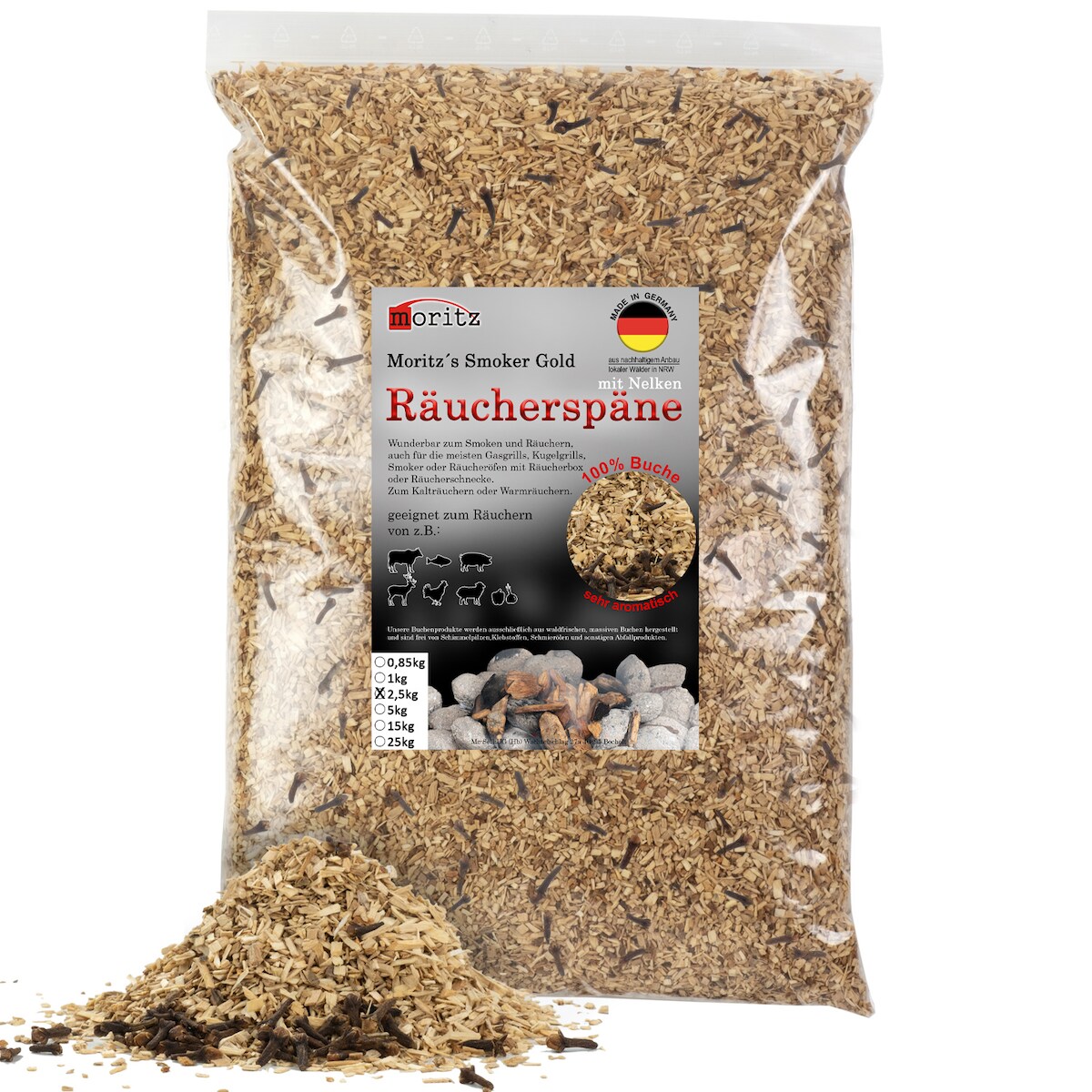 Moritz 2,5kg Räucherspäne Buche mit Nelke fein 0,75 -2 mm Räuchern I Kalträuchern von Fisch Fleisch Wurst Käse auch für BBQ I Grill - Räuchermehl