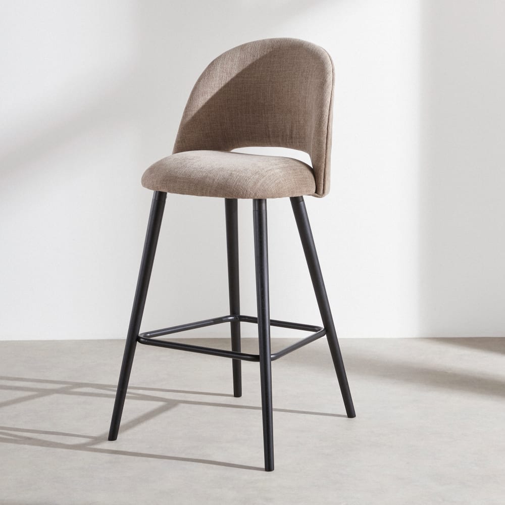 Sgabello da bar in tessuto color caffellatte e legno di hevea nero alt. 80 cm