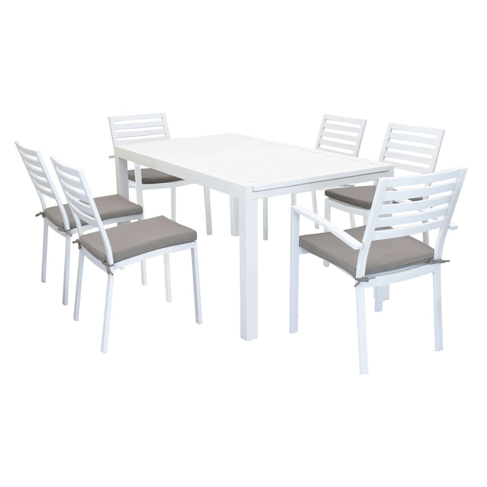 Set tavolo con 4 sedie e 2 poltrone in alluminio bianco 90x240x75