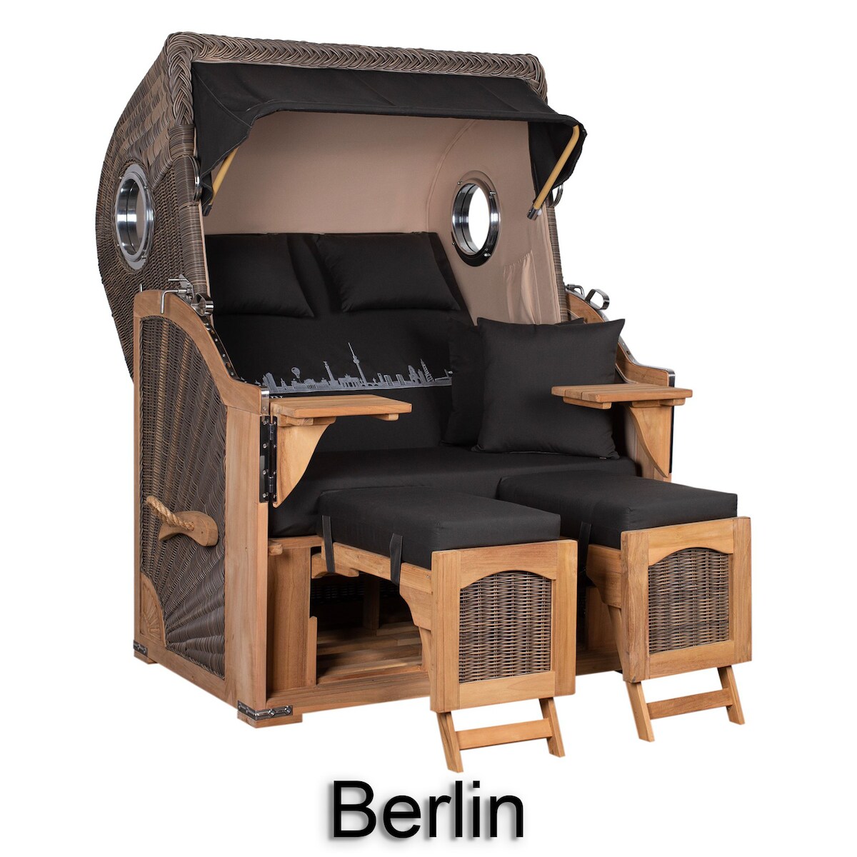 Mr. Deko Strandkorb - bene living - Ammersee Teak Bullauge - PE grau - Skyline Berlin - Liftersystem