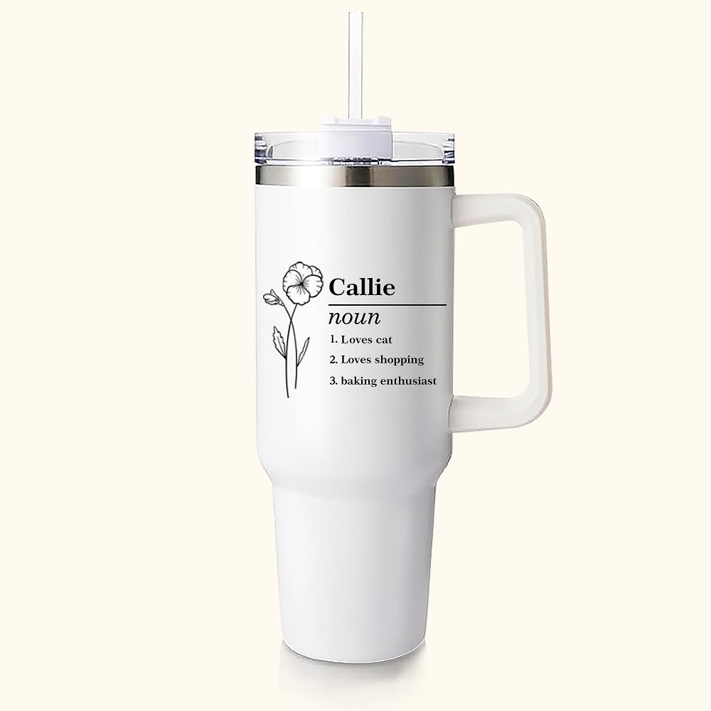 Definizione personalizzata del nome del fiore di nascita Tumbler isolato da 40 oz con testo e cannuccia Regalo di compleanno per donne