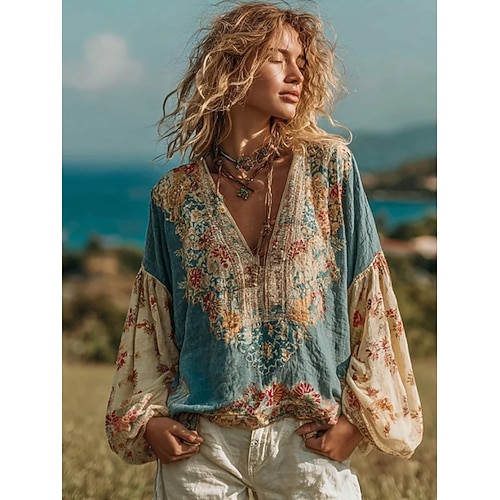 Per donna Camicia Floreale Grafico Elegante Bohemien Vintage Manica Lunga Scollo a V Top Regolari Quotidiano Ferie Patchwork Bottoni Stampato Blu Bianco Rosa Azzurro Estate Primavera