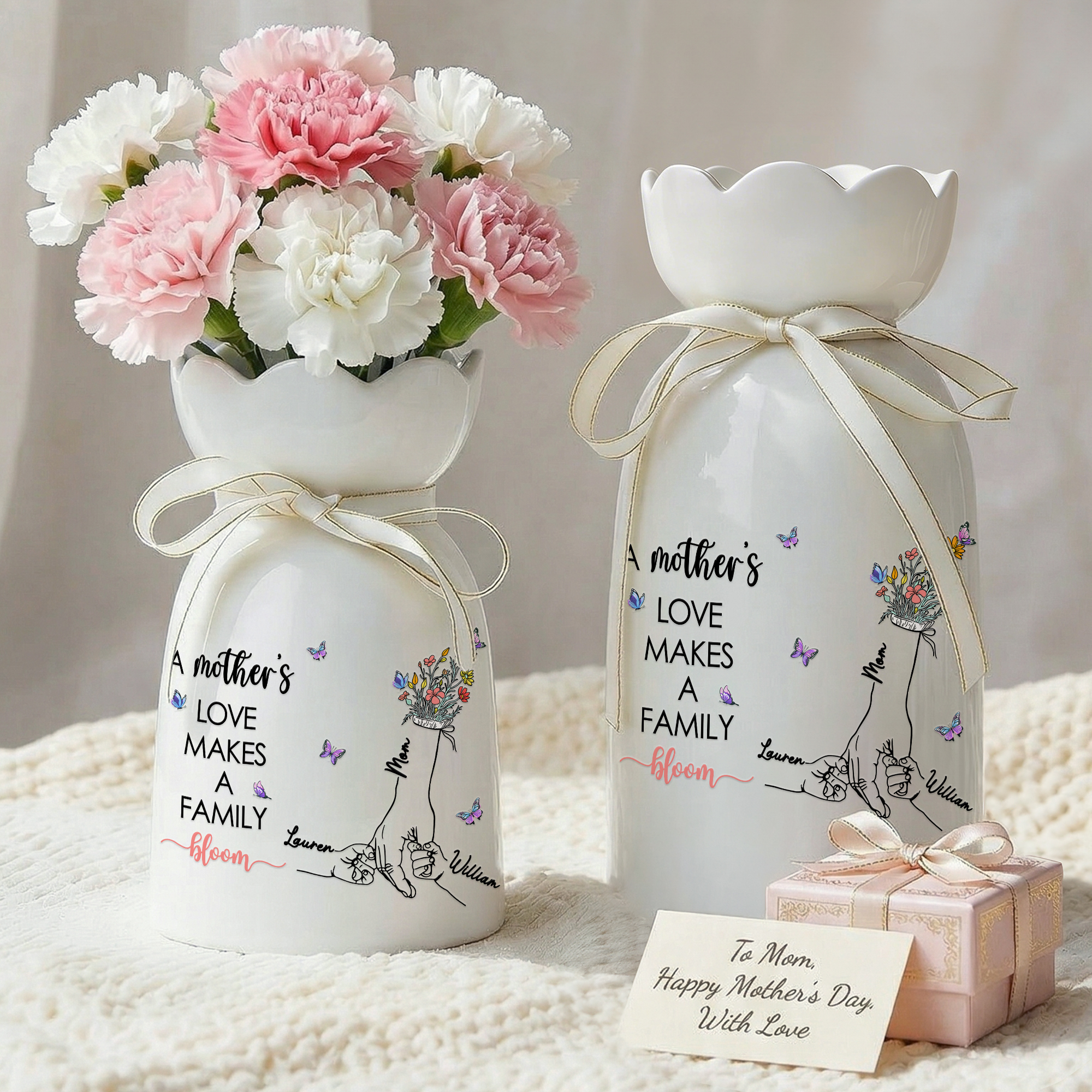 Vase en céramique personnalisé mains dans les mains fleurs papillon avec noms et textes Décoration maison Cadeau de fête des mères pour maman grand-mère