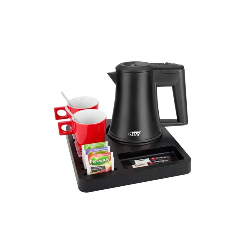 Willkommenstablett SQUARE Schwarz mit Wasserkocher STAR 0,5 L Schwarz und 2 rote Porzellantassen