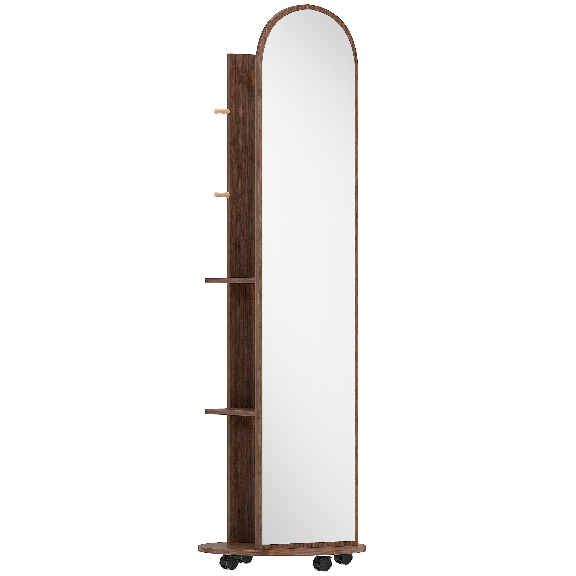 HOMCOM 2-in-1 Full Length Mirror with Storage Shelves, Floor Mirror with 4 Wheels, Coat Rack, Hooks, Brown Wood Effect