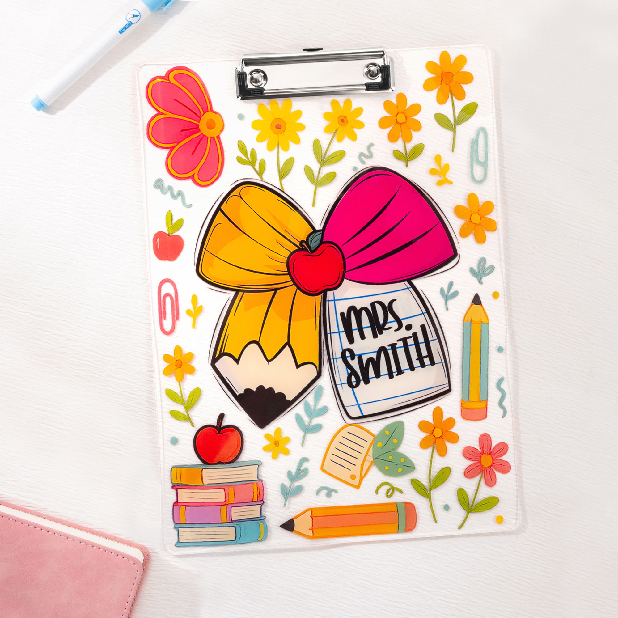 Gepersonaliseerde Floral Pencil Bow Acryl A4 Klembord met Tekst Schoolbenodigdheden Terug naar School Waardering Gift voor Leraren