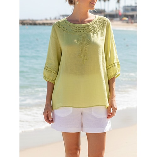 Per donna Blusa 100% cotone Floreale Elegante Essenziale Casual Manica 3/4 Girocollo Top Regolari Quotidiano Ricamato Nero Rosa Verde Estate Primavera