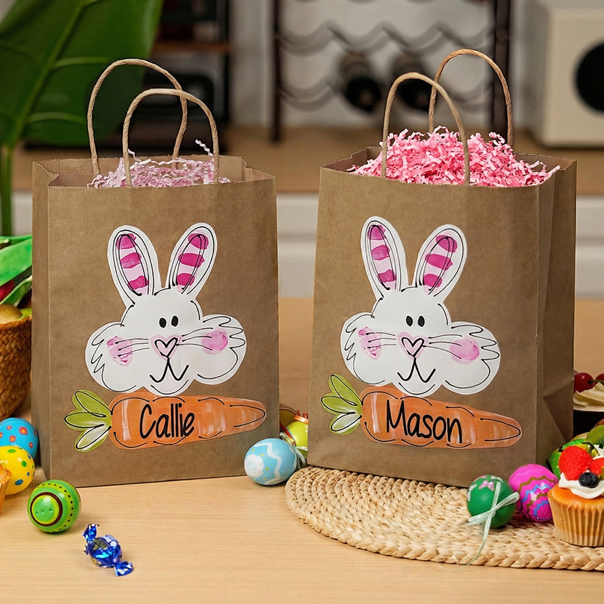 Personalizzato carino disegnato a mano stile coniglietto carota sacchetti di carta Kraft con il nome Set di 3 festa favore felice regalo di Pasqua per i bambini
