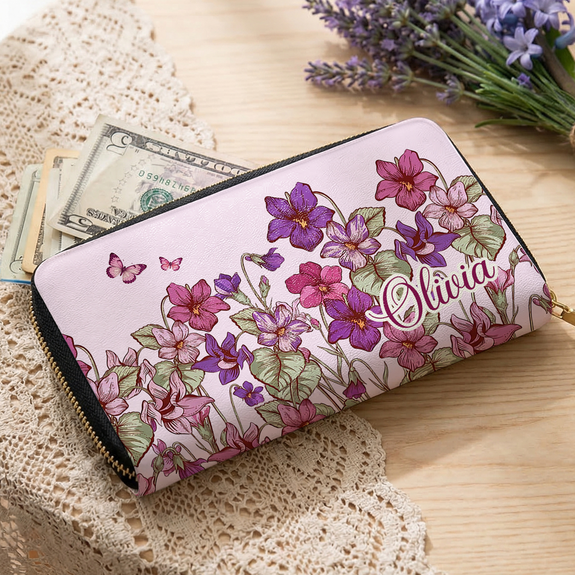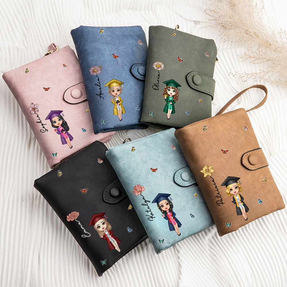 Portafoglio da polso con nome e portacarte Personalizzato per laureati Personaggio nascita Fiore Farfalla in pelle con nome e portacarte Regalo di laurea per donna