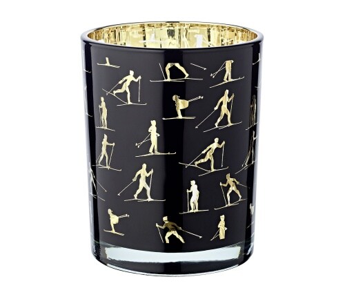 EDZARD Windlicht Monty (Höhe 13 cm, ø 10 cm), Windlicht mit Skisport Motiv, innen gold / außen schwarz