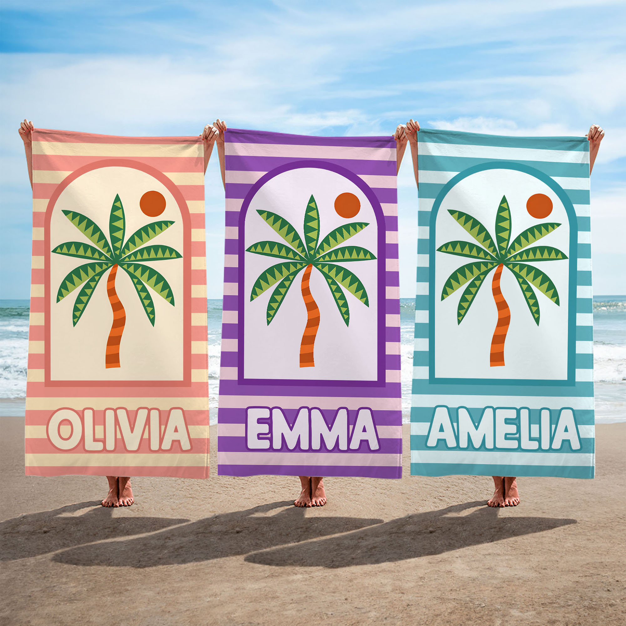 Asciugamano da spiaggia personalizzato in microfibra con nome, a strisce di palme, ad asciugatura rapida, uso vacanza estiva, regalo di compleanno per amici e famiglia