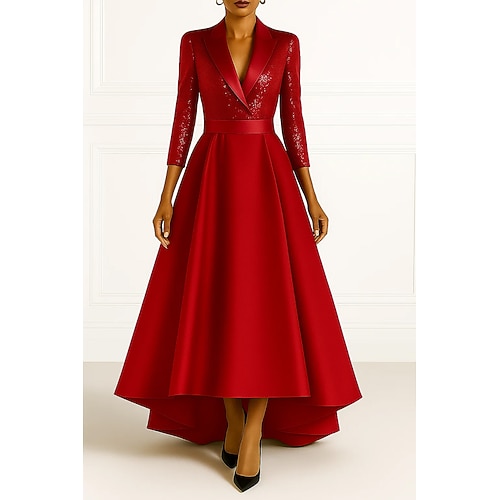 Abiti cocktail A-Line abito elegante matrimonio formale lunghezza tea abito alto-basso manica media scollo a V in raso elastico con applicazioni in paillettes tasca