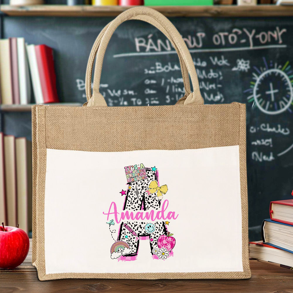 Personlig Leopard Print Dalmatian Dot Pencil Jute Tote Bag med namn Lärarens dag Uppskattning Tillbaka till skolan Födelsedagspresent till lärare