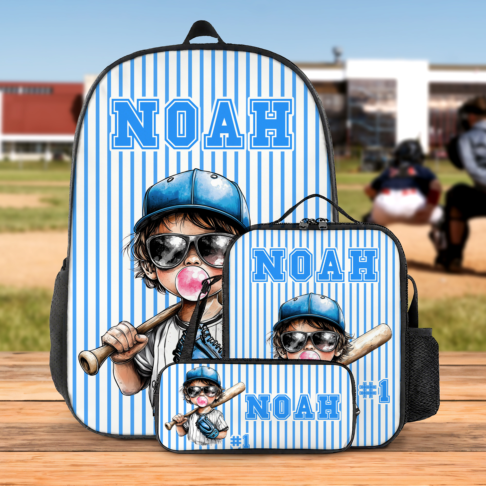Gepersonaliseerde Stripes Cartoon Baseball Kid Character Rugzak Lunch Bag Pencil Case Set met Naam Terug naar School Verjaardagscadeau voor Jongens Meisjes