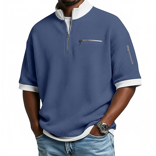 Per uomo Maglietta Waffle Maglietta Manica Corta Maglione Mezza zip Estate Tinta unica Moda Designer Confortevole Patchwork Blocco di colore Tasca con cerniera Casuale Quotidiano All'aperto Blu
