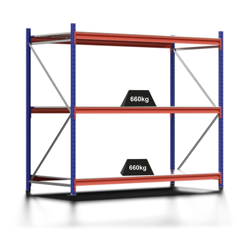PROREGAL Weitspannregal MOOSE Stecksystem Omega-Profil, Grundregal, HxBxT 200x222x100cm, 3 Ebenen, Spanplatten-Fachboden, Fachlast 660kg, Blau/Orange