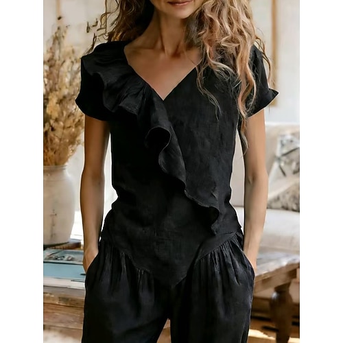 Per donna Camicia Estiva Camicia casual Blusa Volant Tinta unica Vintage Elegante Manica Corta Scollo a V Top Regolari Quotidiano Ferie Uscire Blu Nero Rosso Marrone chiaro Verde Estate Primavera