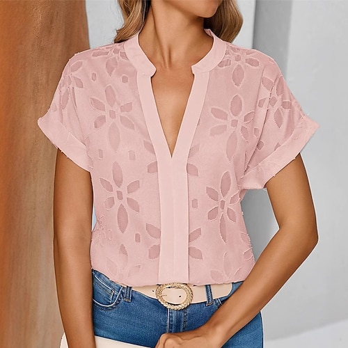 Per donna Camicia casual Camicia con Bottoni Blusa Bottoni Pizzo Illusione Tinta unica Quotidiano Elegante Casual Manica Corta Collo alla coreana Top Regolari Ferie Abbigliamento mare Abbigliamento