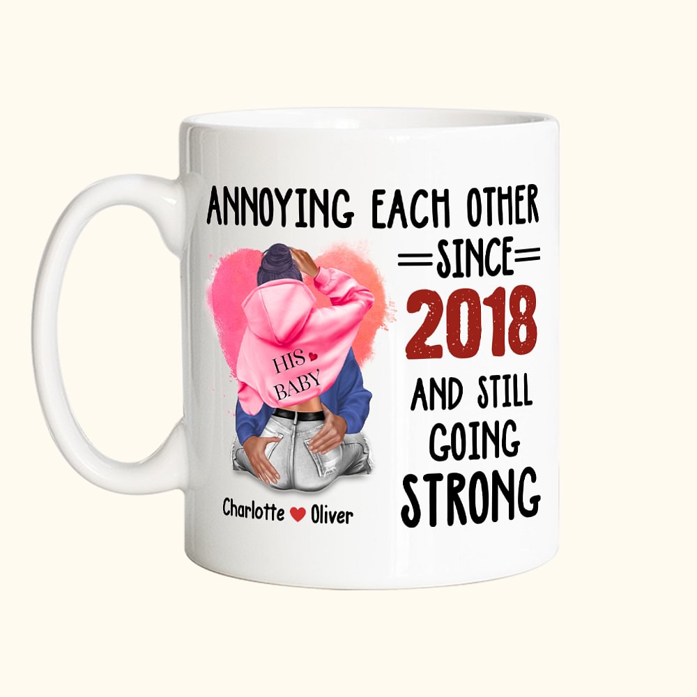 Personlig rosa hjärta vit keramikmugg med namn Irriterar varandra sedan åratal och går fortfarande starkt Alla hjärtans dag-present för par