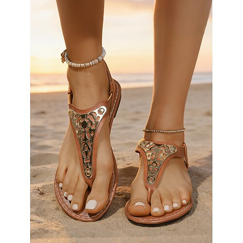 sandali da spiaggia piatti con cinturino a T da donna: eleganti infradito con dettagli metallici per le vacanze estive e le fughe tropicali