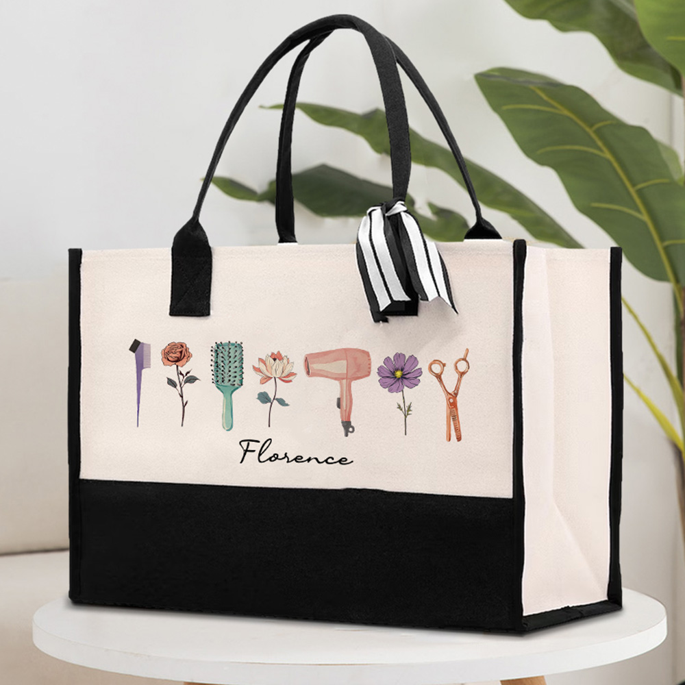 Personnalisé Aquarelle Coiffure Design 3 Fleurs de naissance Canvas Tote Bag avec Nom Anniversaire Appréciation Cadeau pour Stylistes Amoureux de la Coiffure