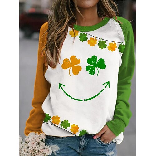 Felpe da donna per il Giorno di San Patrizio con grafica trifoglio casual a maniche lunghe colletto rotondo tops regolari casual stampa vacanza verde erba bianco verde primavera inverno