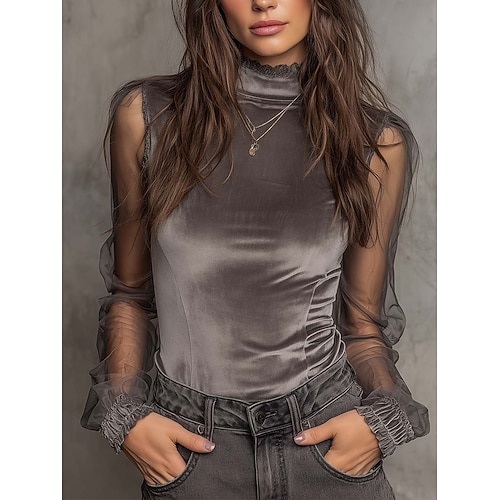 Per donna Camicia Velluto Blusa Rete Semplice Vintage Elegante Classico Manica Lunga Collo Alto Top Regolari Quotidiano Ferie Uscire Grigio Primavera Autunno