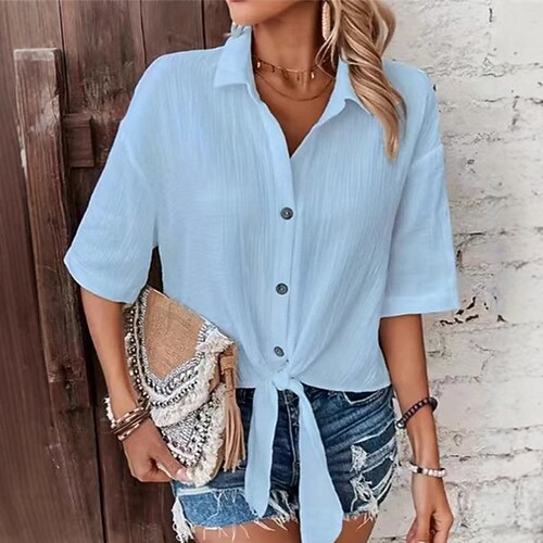 Per donna Camicia casual Camicia con Bottoni Blusa Arricciato Nodo frontale Bottoni Tinta unica Semplice Quotidiano Elegante Casual Mezza Manica Collo ripiegato Top Regolari Quotidiano Ferie