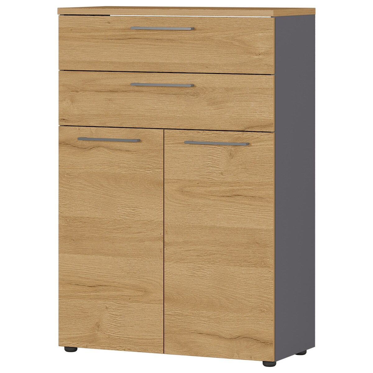 bümö Andratx Mehrzweckschrank 80cm breit, Büroschrank mit 2 Schubladen, Aktenschrank klein, Schrank mit Regal, Kommode in Graphit-Eiche aus Holz,