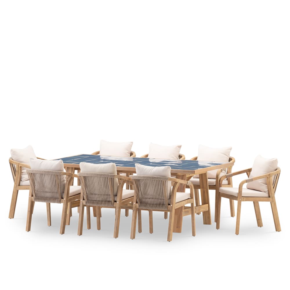 Set di tavolo in legno e ceramica blu e 8 sedie