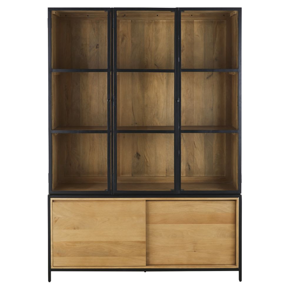 Vaisselier 2 portes en bois de manguier massif, verre trempé et métal noir mat L88