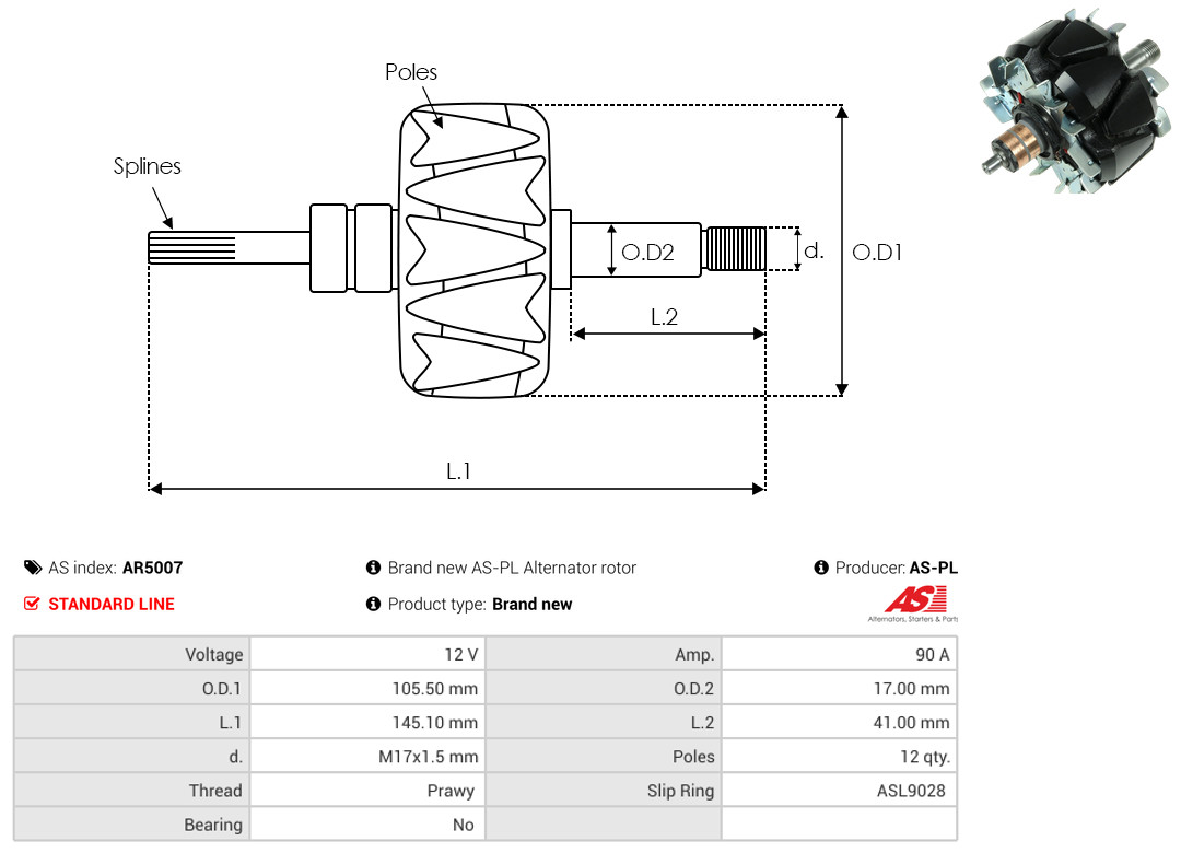 AS-PL Läufer, Generator AR5007 Universal 12V 90A 105,50mm für MITSUBISHI MAZDA A880T70470 A880T59770 K801-18-W35