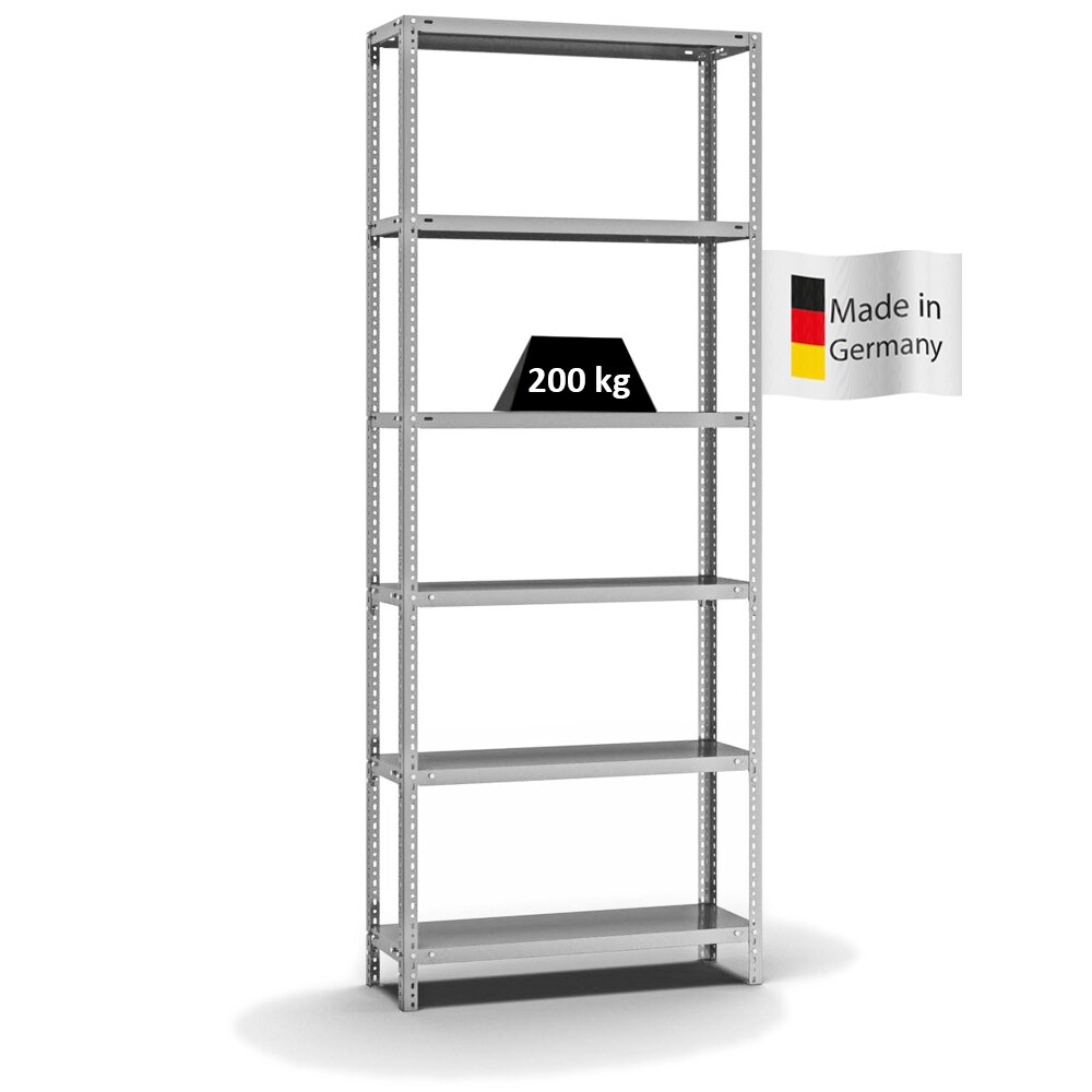 PROREGAL Fachbodenregal Schraubsystem | Grundregal | HxBxT 250x100x30cm | 6 Ebenen | Fachlast 200 kg | Beidseitig nutzbar | Verzinkt